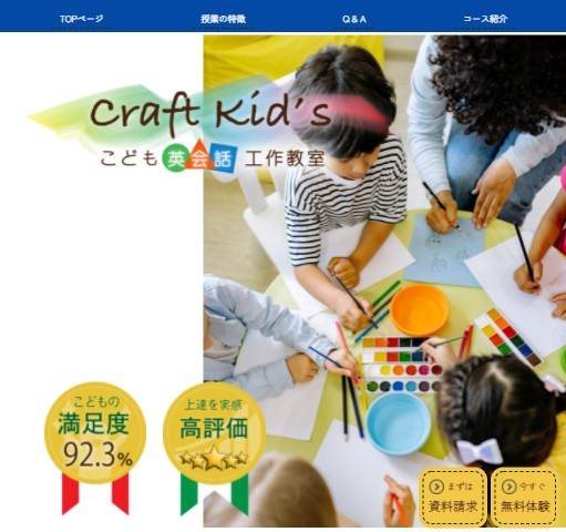 このランディングページは、「工作を通じて英語にふれる」をテーマとした英会話教室の宣伝広告です。工作を通じた効果的な学びをレッスンの特徴として提示した上で、体験レッスンや入会を促すような制作を行いました。また、SEO対策の1つとして、Q&A形式で簡単にレッスンについて紹介しました。