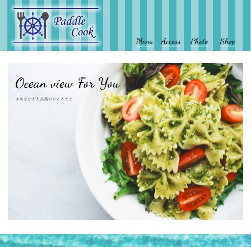 このサイトは、海岸沿いにオープンしたイタリアンレストランをテーマに制作。海が見渡せる開放的な空間を伝えるために、海のロケーションをイメージさせる明るい画像を採用。また、ターゲットとしている家族層が親しみを感じるポップな仕様となるよう、ヘッダーにはストライプの背景を、トップ画像には子供が見て喜ぶリボン型のパスタの写真を選定し制作を行いました。